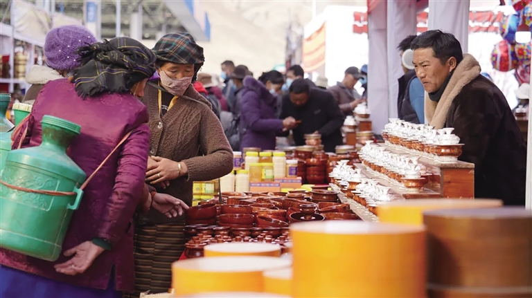 在物交會(huì)現(xiàn)場,民族手工藝產(chǎn)品、生活日用品、家具等各種商品琳瑯滿目。次仁金果藏帽、慈成藏香等種類繁多,生活日用品一應(yīng)俱全,尼泊爾商品更是吸引了眾多市民駐足圍觀。