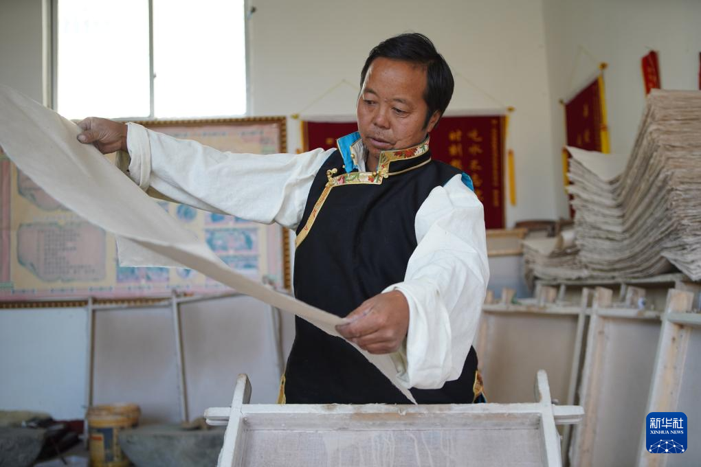 48歲的格桑旦增是“雪拉藏紙制作技藝”傳承人,也是西藏自治區(qū)拉薩市尼木縣雪拉藏紙農(nóng)牧民專業(yè)合作社負(fù)責(zé)人。他世代居住的尼木縣地處高原溫帶半干旱季風(fēng)氣候區(qū),平均每天日照8.3小時。得天獨(dú)厚的自然條件使其自古以來便是影響較大的藏紙產(chǎn)區(qū)之一。