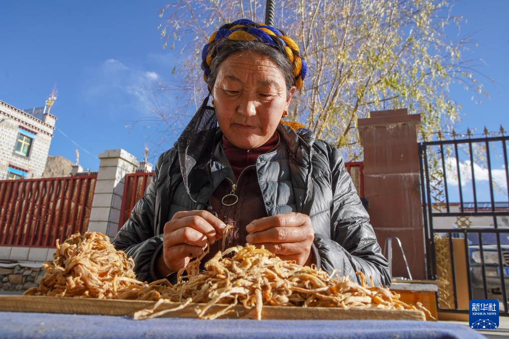 尼木縣塔榮鎮(zhèn)雪拉村村民在給狼毒草分絲,這是制作藏紙的步驟之一(12月5日攝)。新華社記者 關(guān)明輝 攝