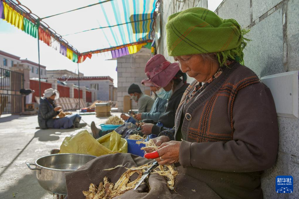 尼木縣塔榮鎮(zhèn)雪拉村村民在給狼毒草去皮,這是制作藏紙的步驟之一(12月5日攝)。新華社記者 邵澤東 攝