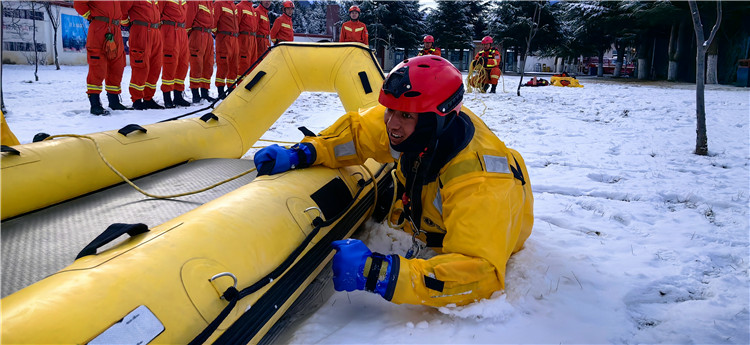“前方發(fā)現(xiàn)一名墜落冰窟人員,現(xiàn)命令你小組攜帶好個人防護裝備及救援裝備實施救援”。針對冰面救援突發(fā)性強、技術(shù)要求高、救援難度大、危險系數(shù)高的特點,中隊教練員采取“邊講解、邊示范,先分步、后連貫,先模擬、后實操”的方式開展訓練。訓練前,教練員首先對冰面救援理論知識進行了講解并對訓練中容易出現(xiàn)的問題提出了相關(guān)要求,指派一名隊員飾演被困人員。訓練中,嚴密組織隊員利用直接救助法、雙面拉梯救援法等救援技術(shù),對“遇難者”進行救援,隊員們配合默契,有條不紊地完成了此次冰面救援模擬訓練。