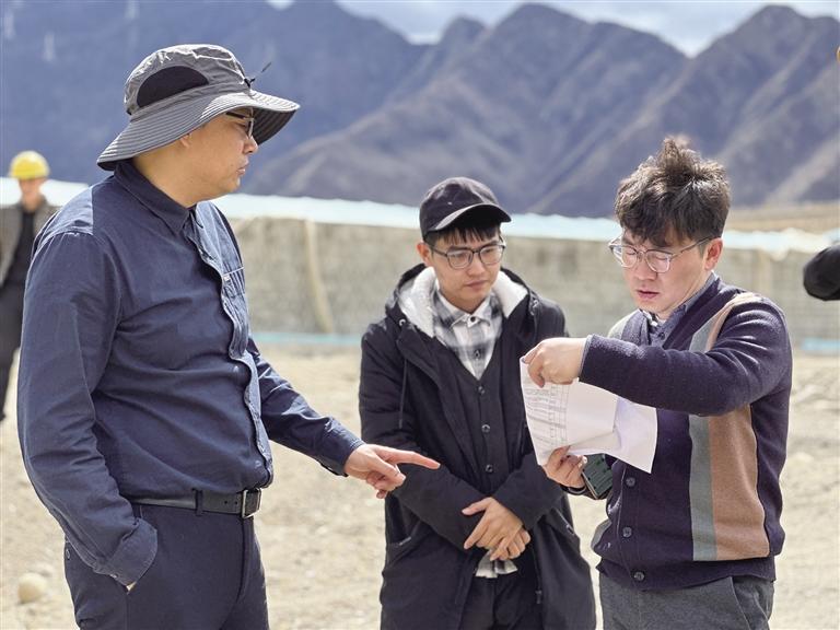 王宇(右一)在援藏項(xiàng)目現(xiàn)場核對(duì)施工圖紙。圖由王宇提供