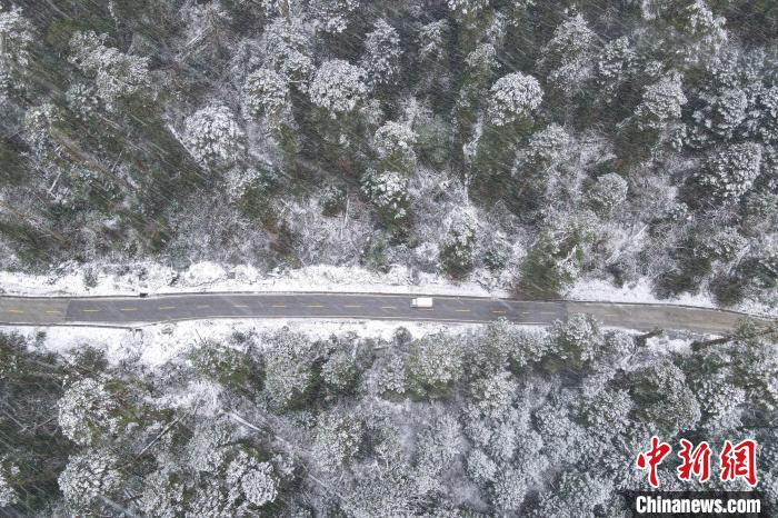 圖為12月18日,西藏林芝墨脫扎墨公路上,一車(chē)輛穿行在林海中。江飛波 攝