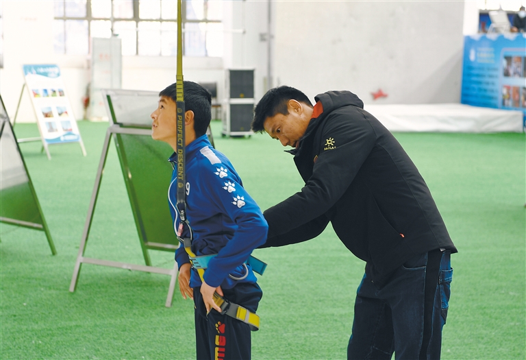 教練幫助學(xué)員做好攀巖前的準(zhǔn)備工作。記者 旦增蘭澤 攝