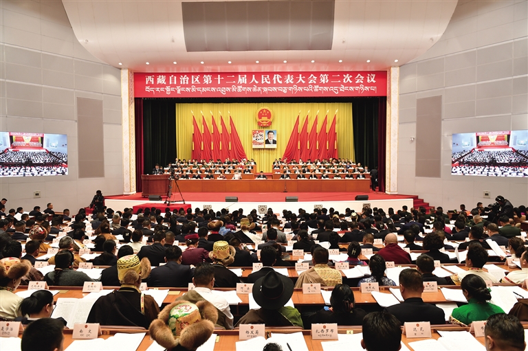 西藏自治區(qū)十二屆人大二次會(huì)議開幕現(xiàn)場(chǎng)?!∮浾摺〈稳势酱搿z
