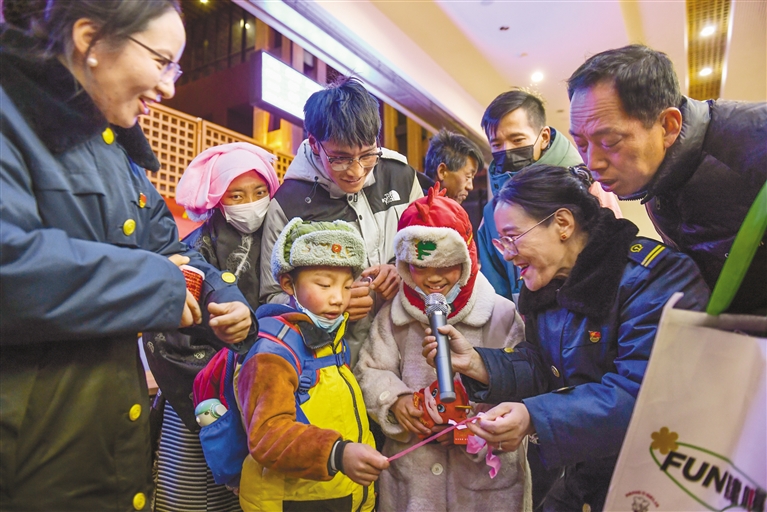 春運首日,拉薩火車站候車大廳開展新春猜謎活動,為參與活動的旅客送上新年伴手禮。記者 丹增群培 攝