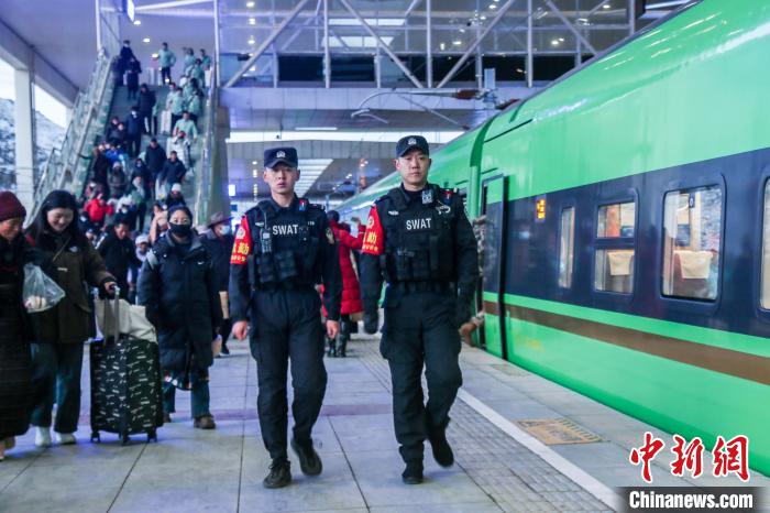 圖為春運首日,拉薩鐵路公安處特警巡查即將發(fā)送的列車。王興楠 攝