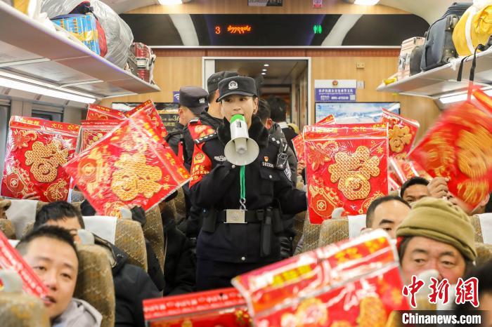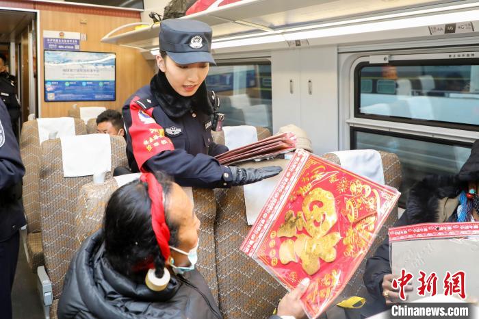 圖為春運首日,拉薩發(fā)往日喀則的C921次列車上,“格桑梅朵”乘警向旅客送“?!弊帧|S飛 攝