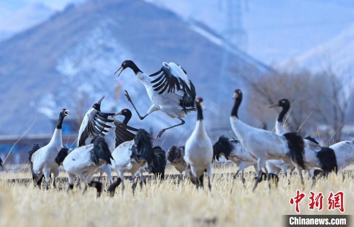 圖為拉薩林周縣黑頸鶴保護區(qū)內(nèi),黑頸鶴正在覓食、嬉戲。貢嘎來松 攝