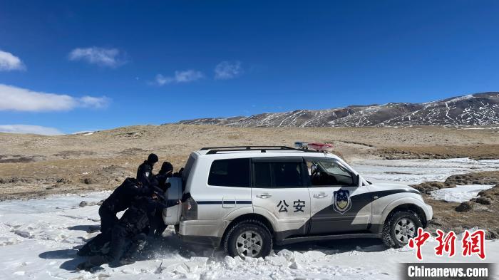 又經(jīng)歷一次陷車后,車輛實在無法前行。簡單吃過自熱午餐后,民警一行帶好裝備開始“步巡”,凜冽的寒風似是帶著刀子般往骨頭里鉆,雪地反射的光讓人睜不開眼,此時海拔已將近5000米,氣溫零下23攝氏度。