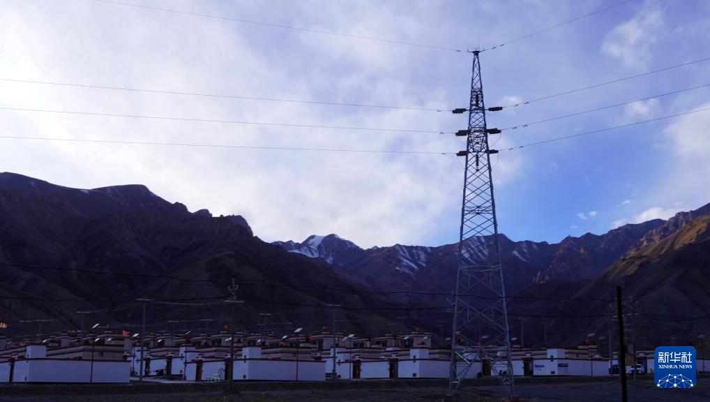 這是楚魯松杰鄉(xiāng)瑪尼唐卡搬遷點(diǎn)的新房和電力鐵塔(2024年1月12日攝)。新華社記者 陳尚才 攝