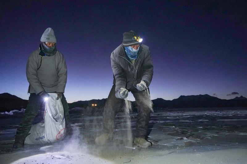 2月1日凌晨5點(diǎn),記者從浪卡子縣趕往推瓦村。村口停放的小貨車?yán)?,整齊地堆放著裝有爐灰的麻袋。村民旺堆告訴記者,冬季里,推瓦村草場不能為羊群提供充足的牧草,而普莫雍措湖心島有著豐茂的水草。因此,在普莫雍措結(jié)冰期,村民們會將羊群趕到湖心島,湖面解凍前再把羊群趕回村里。