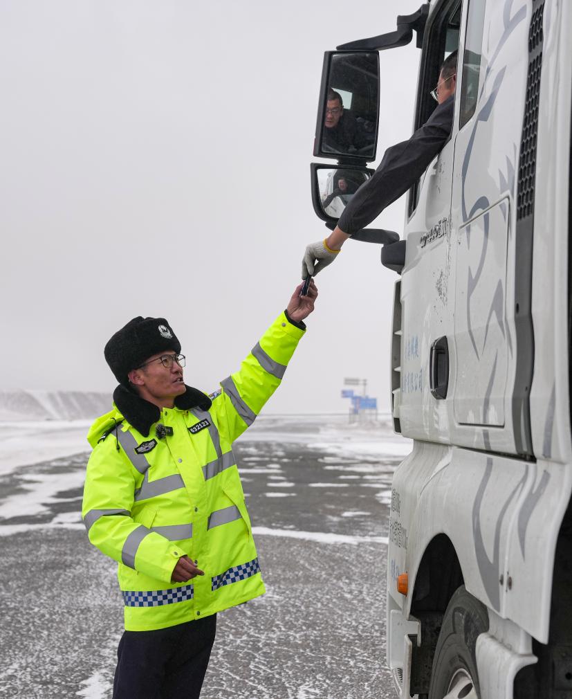 安多交警大隊秩序中隊隊長達娃云旦提醒駕駛員雪天小心駕駛。新華社記者 晉美多吉 攝