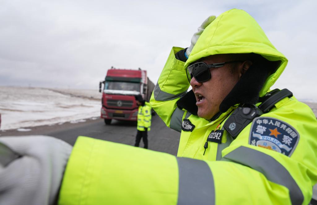 安多交警大隊交警在海拔5231米的唐古拉山口。新華社記者 晉美多吉 攝