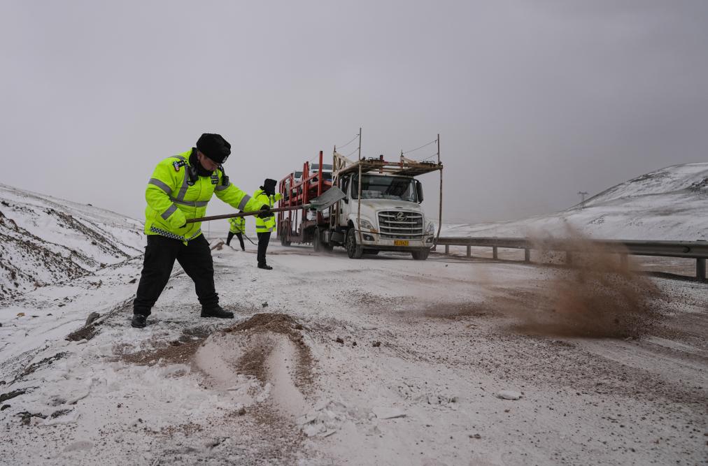 安多交警大隊交警在冰雪路段撒土止滑。新華社記者 晉美多吉 攝