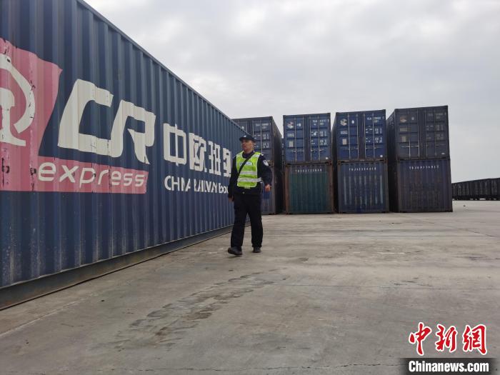 袁倫在中歐班列集裝箱區(qū)域開(kāi)展巡邏。黃巍 攝