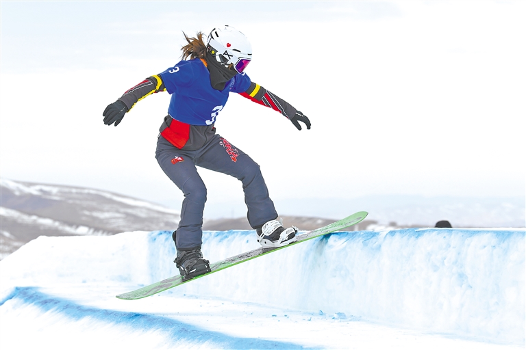 圖為獲得單板滑雪障礙追逐項(xiàng)目青年組女子冠軍的西藏選手擁青拉姆。洛桑 索朗群培 攝
