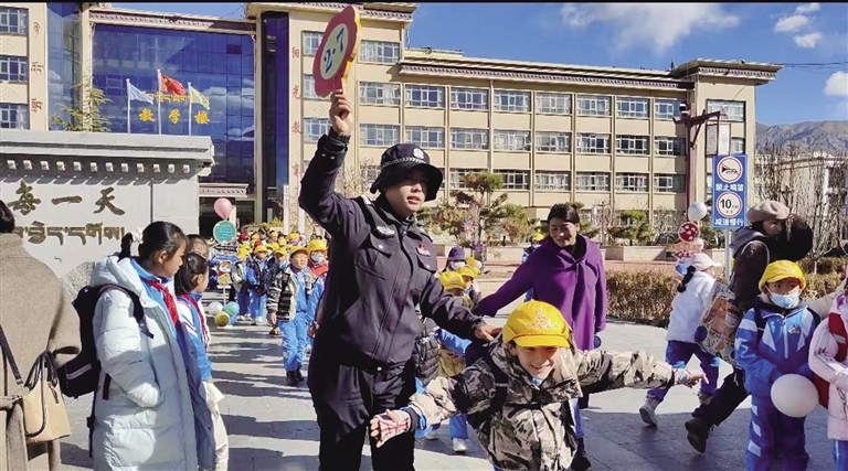 站在學(xué)校門口,等待孩子的家長央金感觸頗深,她告訴記者,每次開學(xué)前、開學(xué)時(shí)、開學(xué)后,都能看到民警們忙碌的身影。為學(xué)校家長提供幫助,為學(xué)生消除安全隱患,營造了安全、和諧、文明的校園環(huán)境,十分感謝他們?!敖裉靾?bào)到啦,我們看到警察叔叔和阿姨就覺得很安心、很開心?!睂?shí)驗(yàn)小學(xué)3年級(jí)10班學(xué)生白瑪娜薩說。