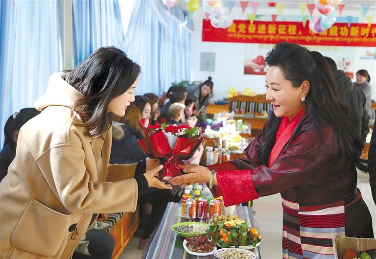 “三八”國際勞動婦女節(jié)來臨之際,山南市瓊結縣中心醫(yī)院組織醫(yī)院婦女職工一起慶祝節(jié)日。圖為瓊結縣中心醫(yī)院院長巴桑潘多(右)為醫(yī)院婦女職工獻上鮮花。 倫珠澤仁 洛桑 攝
