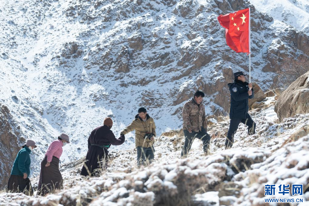 圖為普蘭邊境派出所移民管理警察與村民組成巡邏小分隊(duì)前往中尼5號(hào)界樁巡邏(3月15日攝)。蔣美靈 攝