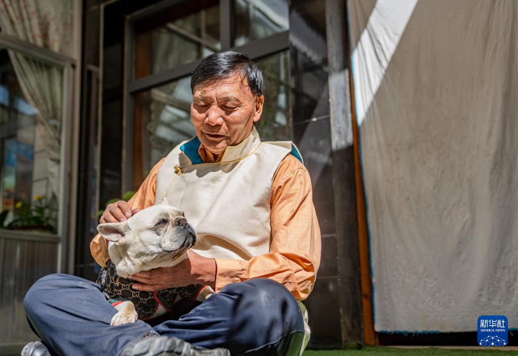 2024年3月28日 普次仁在家中和小狗玩耍(3月23日攝)。新華社記者 丁增尼達 攝