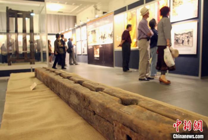 在北京民族文化宮舉辦的西藏今昔——大型主題展上,西藏歷史與封建農(nóng)奴制展區(qū)展出的舊西藏郎子轄監(jiān)獄的刑具——長(zhǎng)方形木制四人腳銬。張勤 攝