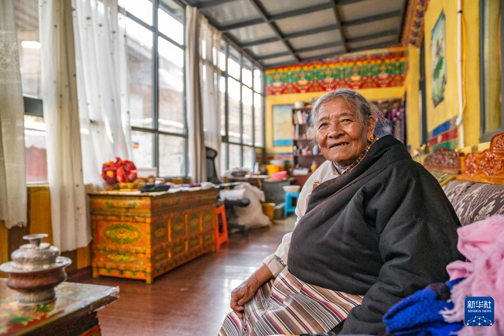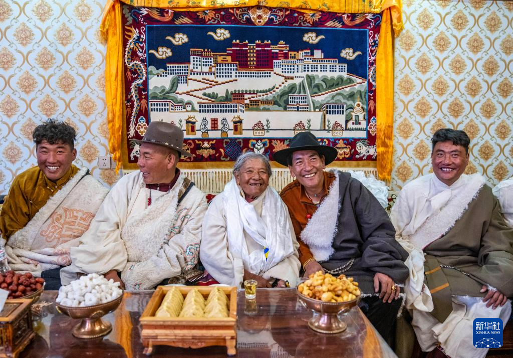2024年藏歷新年,斯曲旺姆的兒女們帶著各自的小家庭來甲根村團聚,孩子們依次給老人獻上哈達、敬上青稞酒。斯曲旺姆被滿堂兒孫圍坐中間,歡歌笑語回蕩在明亮寬敞的客廳里。