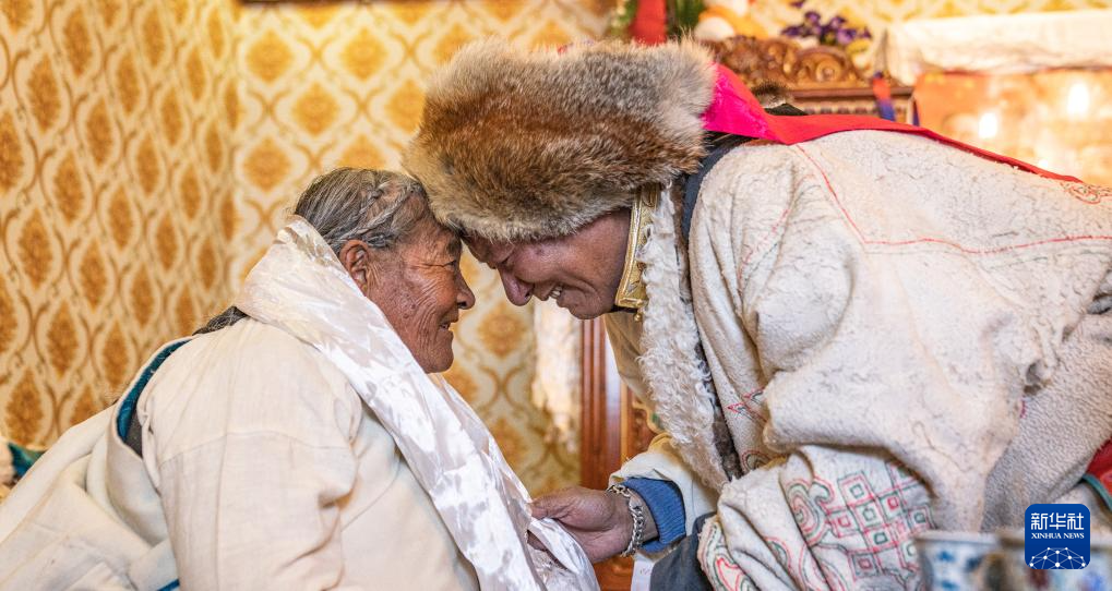 在位于拉薩市當(dāng)雄縣公塘鄉(xiāng)甲根村的家中,斯曲旺姆(左)和家人行碰頭禮(2月10日攝)。新華社記者 丁增尼達 攝