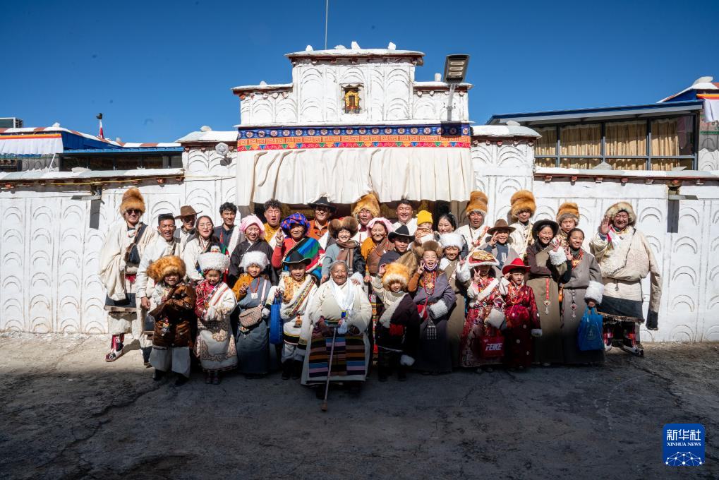 在拉薩市當(dāng)雄縣公塘鄉(xiāng)甲根村,斯曲旺姆(前中)和家人們合影(2月10日攝)。新華社記者 丁增尼達 攝