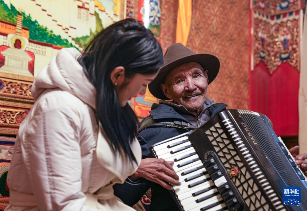 朗杰(右)指導孫女索朗曲珍拉手風琴(3月13日攝)。新華社記者 晉美多吉 攝