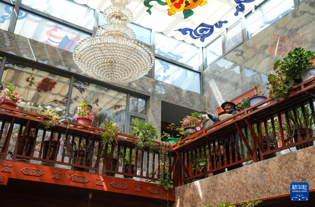 朗杰在自家二樓給花澆水(3月13日攝)。新華社記者 晉美多吉 攝