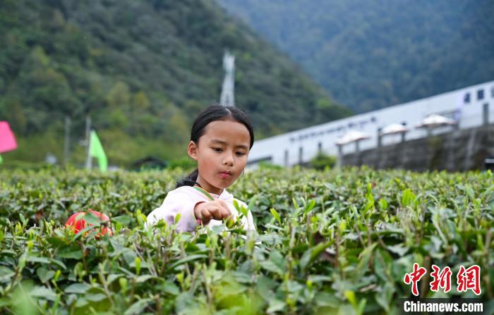 圖為一名小女孩體驗(yàn)采茶。趙朗 攝