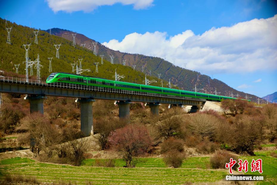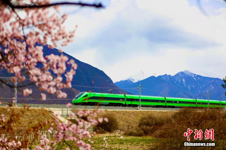 被譽為新“天路”的拉林鐵路,是中國首條高原電氣化鐵路,于2021年6月25日開通運營,結(jié)束了西藏東南地區(qū)不通鐵路的歷史。圖為拉林鐵路沿線桃花盛開,與飛馳而過的動車構(gòu)成別樣風(fēng)景圖。馬生明 攝