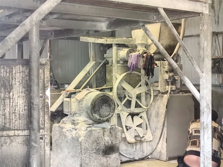 4月10日11時(shí)許,記者跟隨城關(guān)區(qū)市場(chǎng)監(jiān)管局執(zhí)法人員穿過米瓊?cè)账淼?,?lái)到一處由幾間簡(jiǎn)易鐵皮房圍建而成的院落。該院落臨近米瓊?cè)丈铰?,從外面看,任誰(shuí)也想不到這里是一家制粉廠。院落左側(cè)有一間不足60平方米的加工室,室內(nèi)一個(gè)寫有“粉料攪拌機(jī)”字樣的儀器上,布滿了白色污垢。