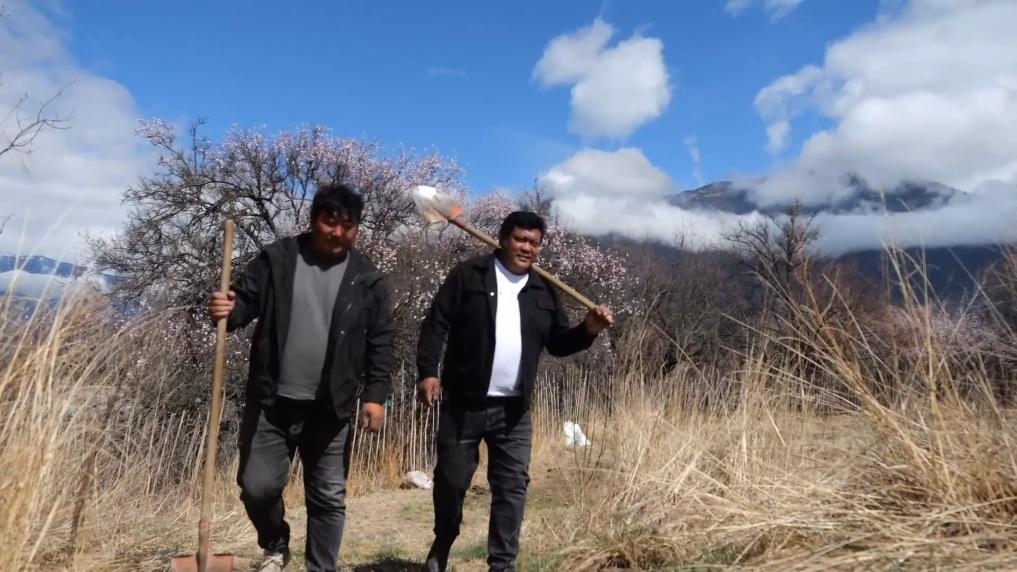 早春,雪域高原逐漸從寒冬中復(fù)蘇。西藏林芝的山林之中,桃花如云霞般綻放。一片芳菲景象中,新一年的生機(jī)與繁榮正在孕育。這天一早,羌渡崗村的兩名干部又一次來到了他們牽掛的村集體果園,查看長勢,整理土地。