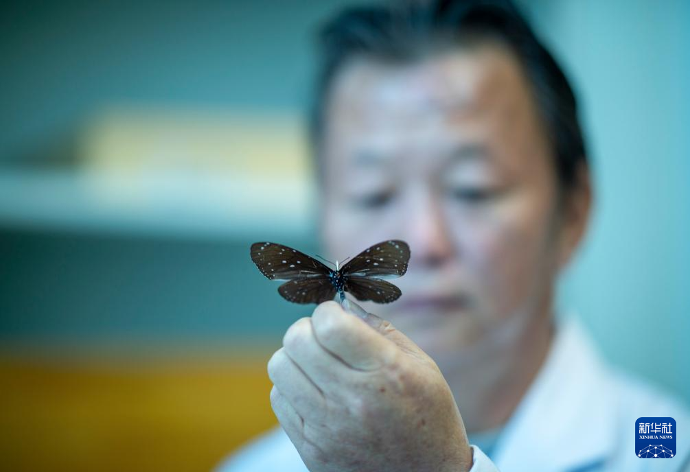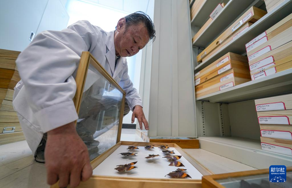 達娃在位于拉薩的西藏自治區(qū)高原生物研究所展示館藏的蝴蝶標本(4月22日攝)。新華社記者 晉美多吉 攝