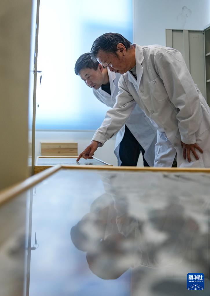 在位于拉薩的西藏自治區(qū)高原生物研究所,達娃(右)和同事查看采集到的昆蟲標本(4月22日攝)。新華社記者 晉美多吉 攝