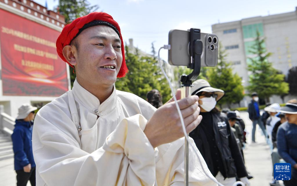 5月12日,在西藏職業(yè)技術學院職業(yè)教育活動周啟動儀式暨比如縣非物質(zhì)文化遺產(chǎn)進校園活動上,來自比如縣的一名旅游推介者在做現(xiàn)場直播。新華社記者 張汝鋒 攝