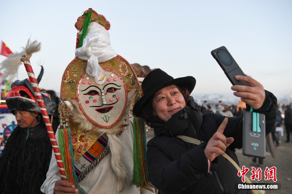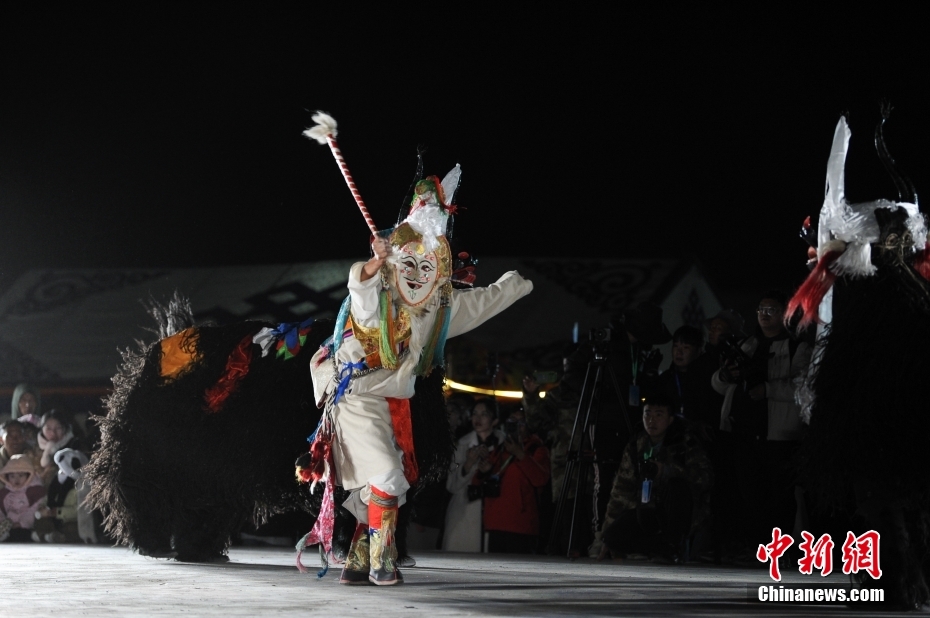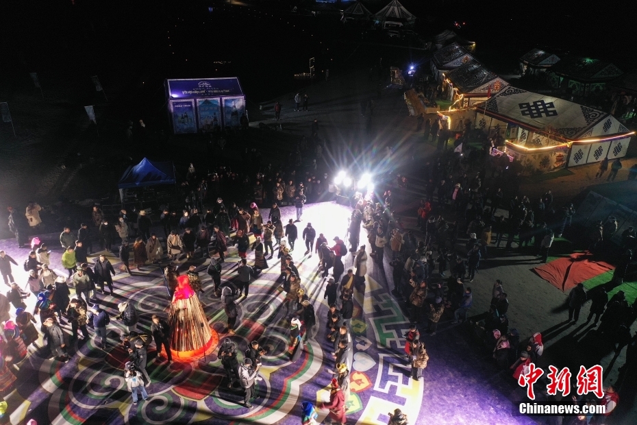 5月18日晚,西藏拉薩市當(dāng)雄縣納木錯湖畔,當(dāng)?shù)啬撩駧в慰腕w驗篝火鍋莊舞。納木錯,被譽(yù)為“天湖”,吸引著大量游客前來觀光。圖為篝火鍋莊舞晚會上的文藝演出。