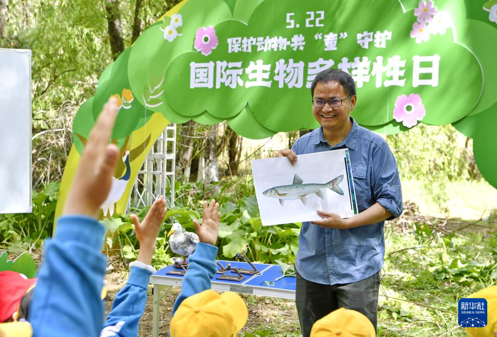 5月22日,西藏大學(xué)生態(tài)環(huán)境學(xué)院教授張繼峰向小學(xué)生普及有關(guān)西藏魚類的知識(shí)。新華社記者 張汝鋒 攝