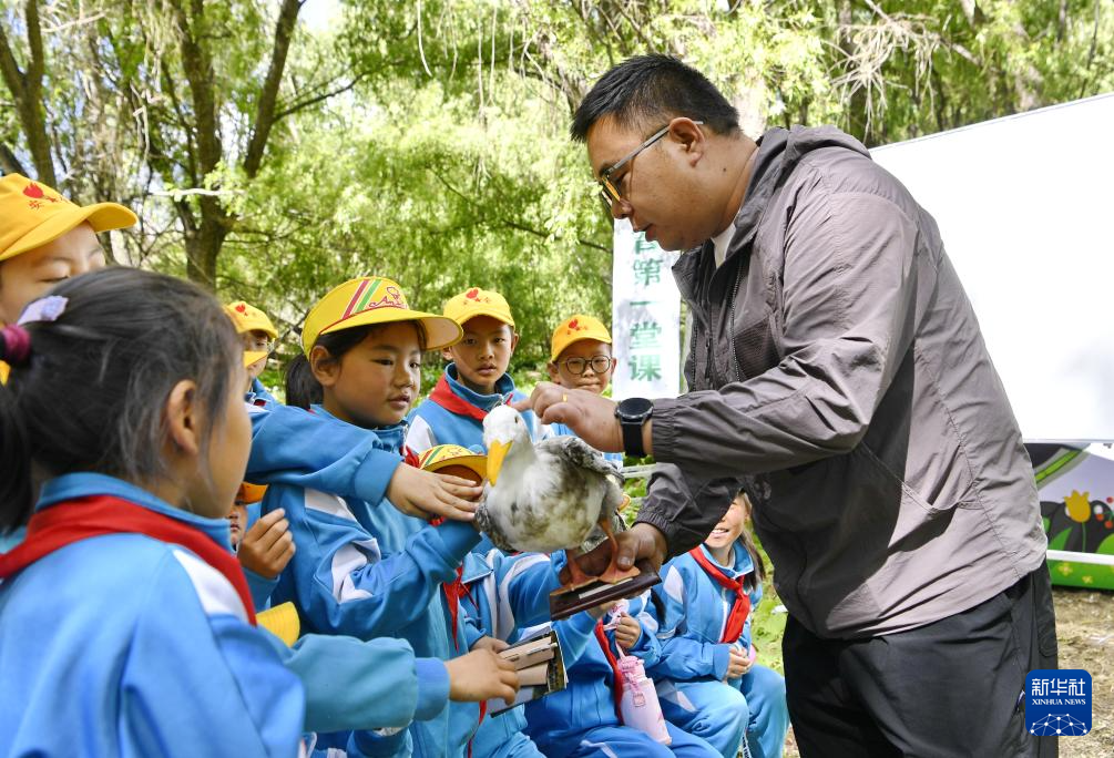 5月22日,西藏大學(xué)生態(tài)環(huán)境學(xué)院助理實(shí)驗(yàn)師朱文琎向小學(xué)生展示鳥類標(biāo)本。新華社記者 張汝鋒 攝