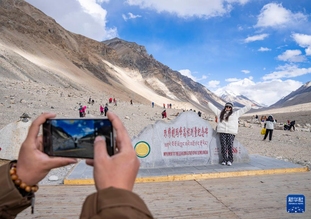 游客在珠穆朗瑪峰高程測(cè)量紀(jì)念碑前拍照留念(5月24日攝)。