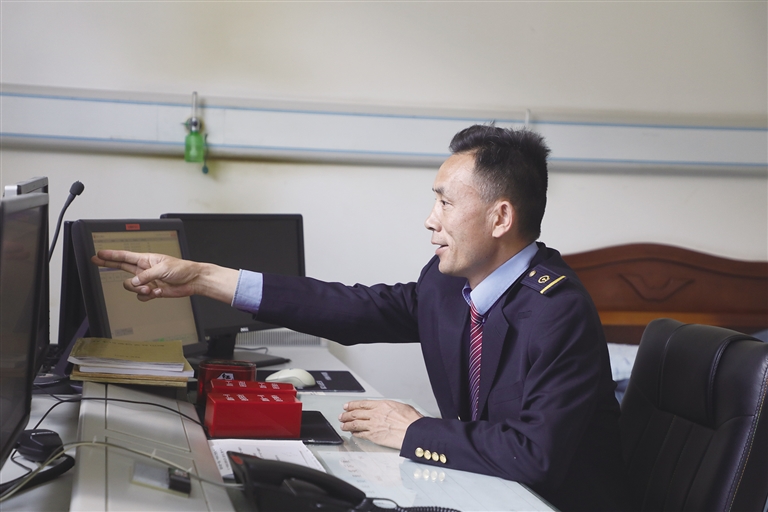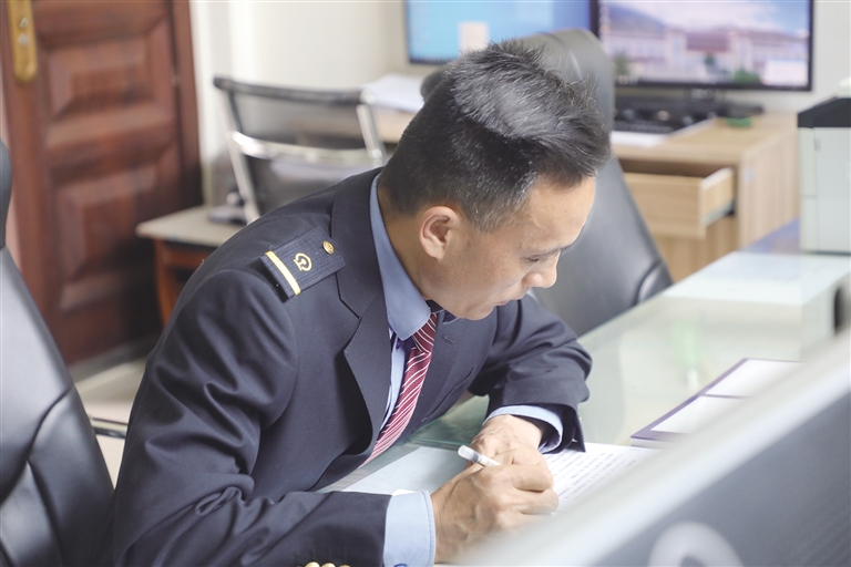 “這里的工作雖然看似單調(diào),實則責任很大。”賀文貴身穿深藍色的鐵路制服,胸前佩戴著亮閃閃的工牌,顯得精神抖擻。他像一名嚴謹?shù)膽?zhàn)士,緊盯著操作臺,確認信號,口呼手指?!∽鳛檐囌局蛋鄦T,賀文貴每天的任務主要是監(jiān)視列車進路和區(qū)間動態(tài),保證行車安全。工作中的他認真負責,嚴格執(zhí)行標準化作業(yè),他常說:即使單人值守,該有的程序、作業(yè)步驟一項都不少,作業(yè)標準必須嚴格執(zhí)行,保證作業(yè)安全。