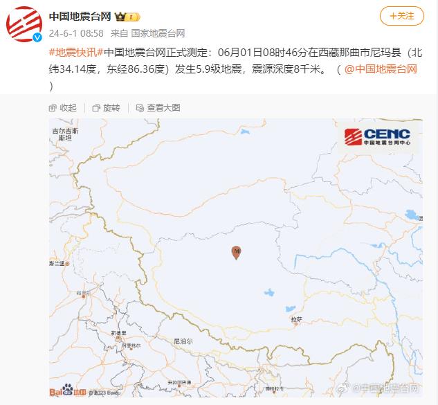 中國地震臺網正式測定:06月01日08時46分在西藏那曲市尼瑪縣(北緯34.14度,東經86.36度)發(fā)生5.9級地震,震源深度8千米。