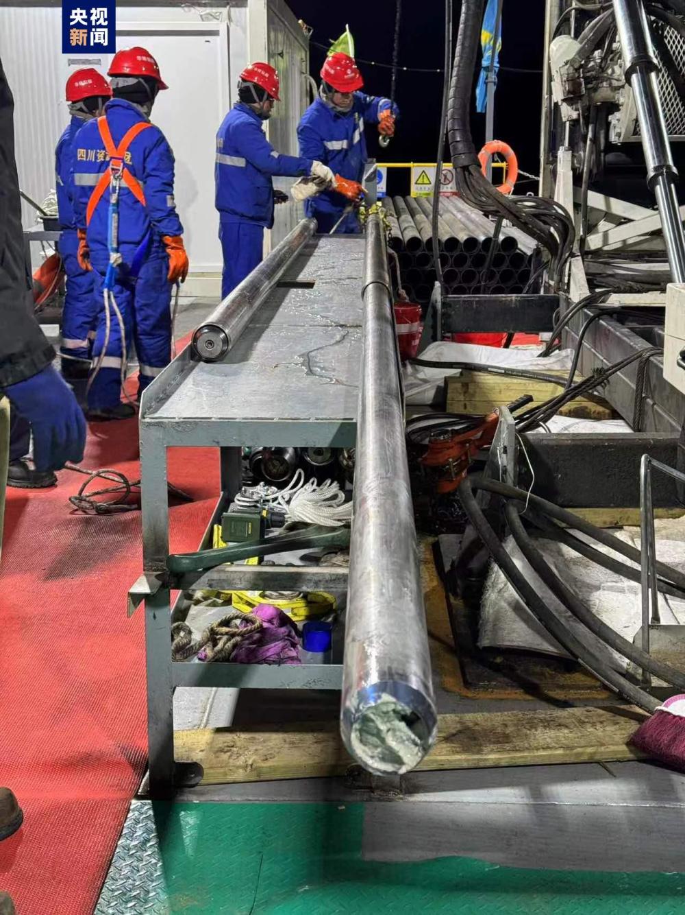 6月6日作為鉆芯的第一天,經(jīng)過不斷地調(diào)整和試驗,當(dāng)晚23時20分,第一次正式鉆探開始,鉆頭深入到了水下95米左右的位置,在第一個點位開始鉆取湖泊巖芯。23時40分,科考團隊獲得了第一批湖泊巖心樣本??蒲袌F隊每次鉆取3米一段,通過24小時輪班不間斷作業(yè),截至7日早6時,已獲得9米長的巖芯。