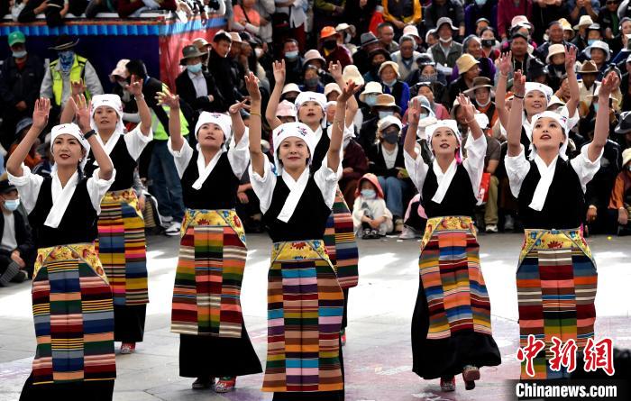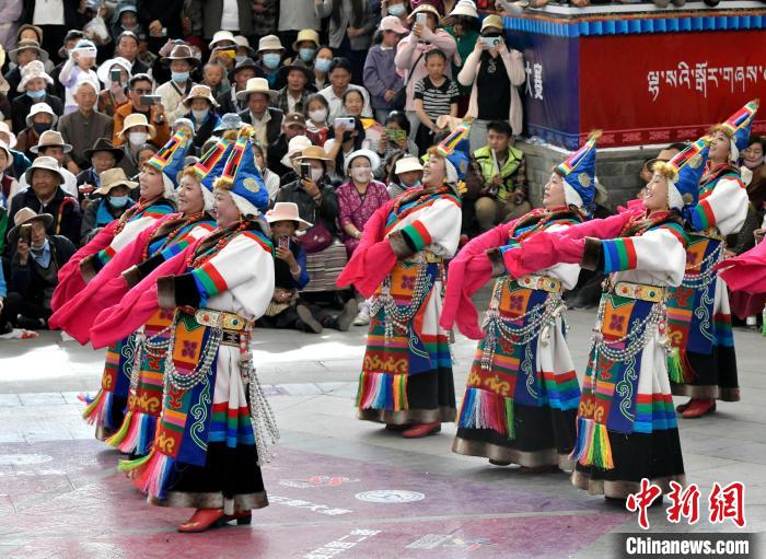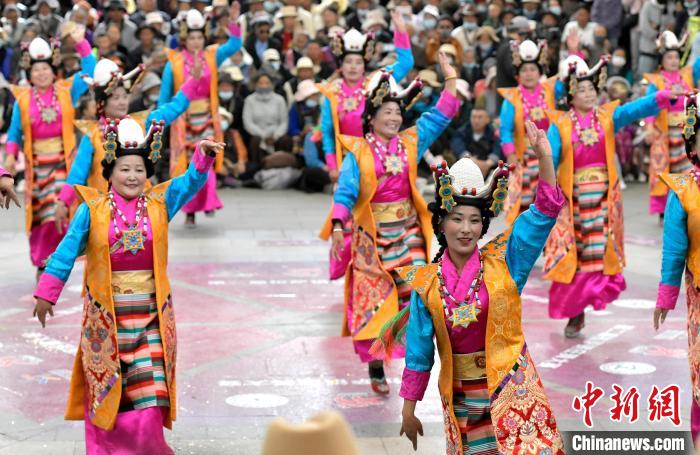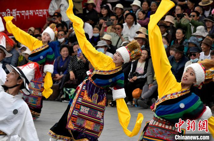 6月14日,第二屆拉薩鍋莊舞大賽決賽在布達(dá)拉宮腳下的宗角祿康公園舉辦,共有12支隊伍參賽。圖為鍋莊舞大賽決賽現(xiàn)場。中新社記者 李林 攝