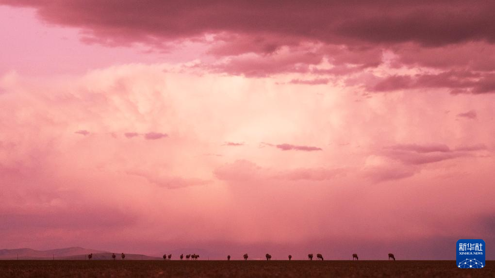 晚霞中魯確塘草原上待產(chǎn)的藏羚羊(6月16日攝)。新華社記者 費茂華 攝