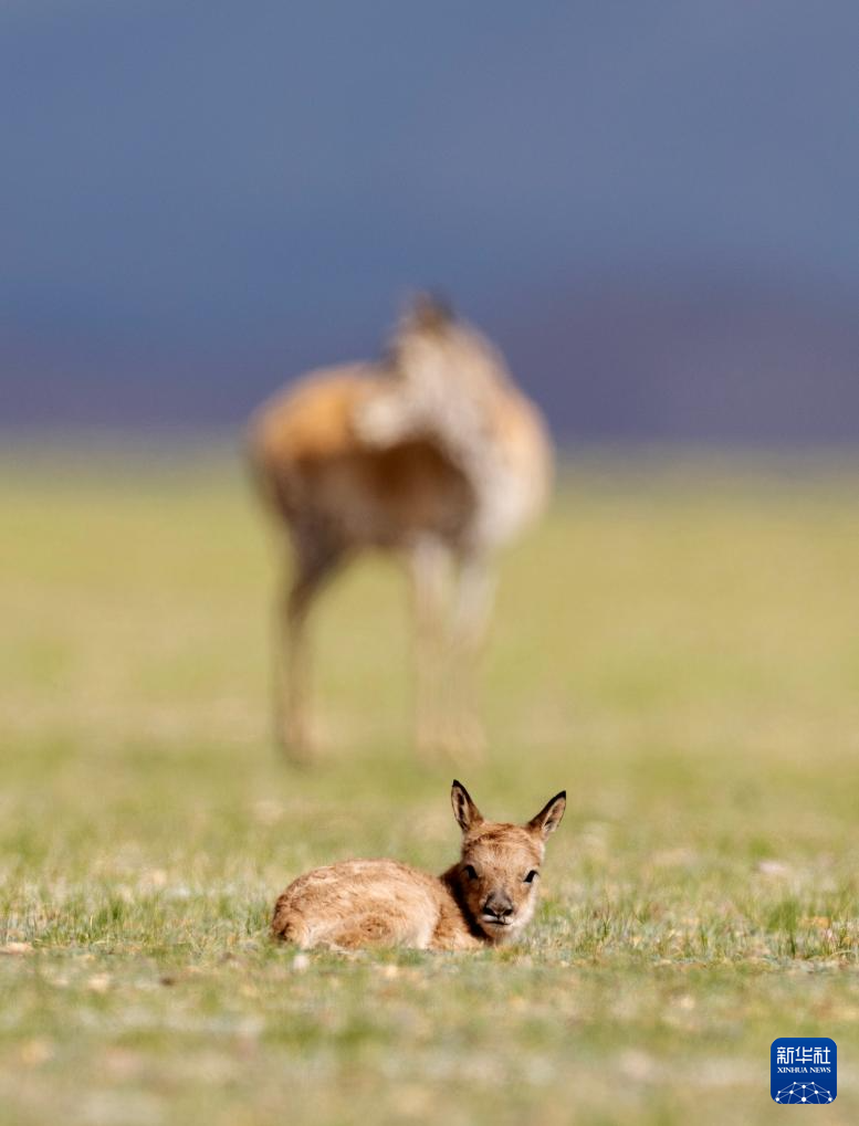 6月17日,在魯確塘草原,出生不久的小藏羚羊趴在草地上休息,一只母藏羚羊在一旁守護。新華社記者 費茂華 攝??