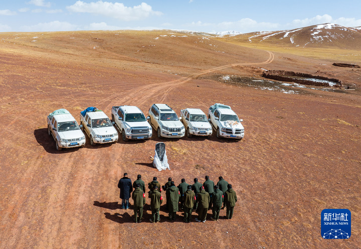 野生動(dòng)物專業(yè)管護(hù)隊(duì)員們?cè)跓o(wú)人區(qū)深處的羅布玉杰烈士紀(jì)念碑前默哀致敬(無(wú)人機(jī)照片,5月10日攝)。 新華社記者 姜帆 攝