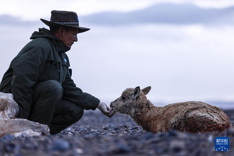 羌塘國(guó)家級(jí)自然保護(hù)區(qū)的野生動(dòng)物專業(yè)管護(hù)隊(duì)員在安撫受傷的藏羚羊(6月13日攝)。新華社發(fā) 旦增 攝